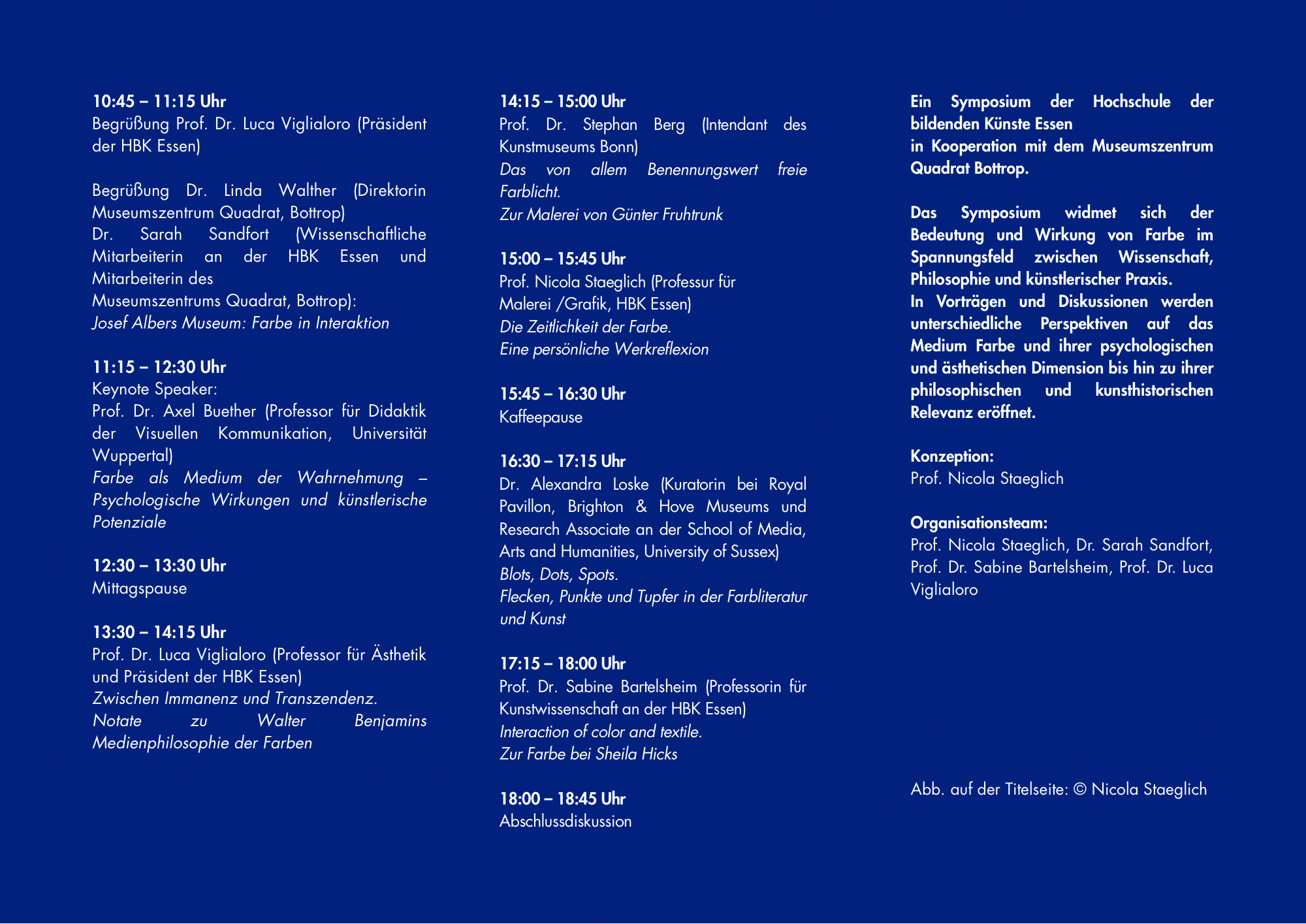 Das Symposium widmet sich der Bedeutung und Wirkung von Farbe im Spannungsfeld zwischen Wissenschaft, Philosophie und künstlerischer Praxis. In Vorträgen und Diskussionen werden unterschiedliche Perspektiven auf das Medium Farbe und ihrer psychologischen und ästhetischen Dimension bis hin zu ihrer philosophischen und kunsthistorischen Relevanz eröffnet.