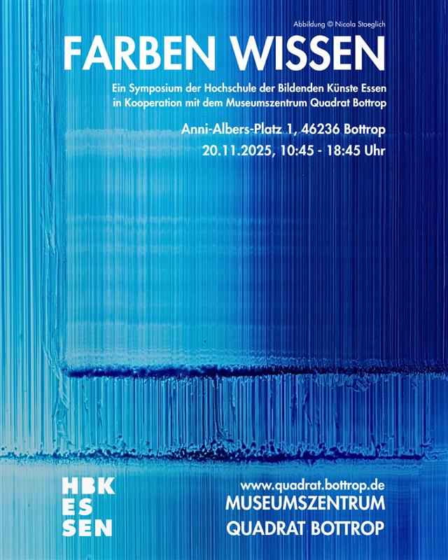 Am 20. November 2025 lädt die Hochschule der bildenden Künste Essen (HBK Essen) in Kooperation mit dem Museumszentrum Quadrat Bottrop zum Symposium „Farben Wissen“ ein.